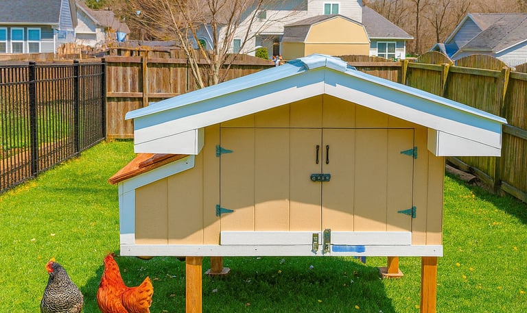Nestled in our backyard, our chicken run is a cozy, thoughtfully designed space built entirely by hand to reflect both function and charm. We designed and constructed the coop ourselves, tailoring every detail to meet the needs of our small flock while blending beautifully into the landscape. Elevated for ventilation and easy access, the coop features secure doors, a gabled roof, and a sunny outdoor run where our hens can forage, dust bathe, and enjoy the day. Surrounded by fencing for safety and framed by seasonal blooms and greenery, this area is more than just a shelter — it's a peaceful retreat where happy chickens thrive and where sustainable living begins.